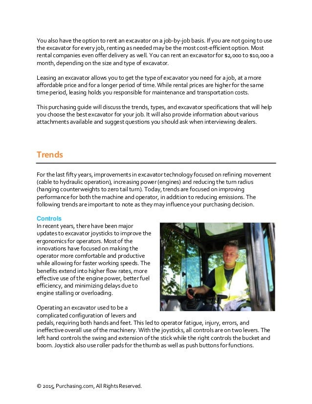 The improper selection and use of excavator can cause excessive costs, time and injuries to labors. Time required for equipment cost may vary from 5% to 10% of the direct cost. renting and leasing are four most common ways for CEA. ... View This Document